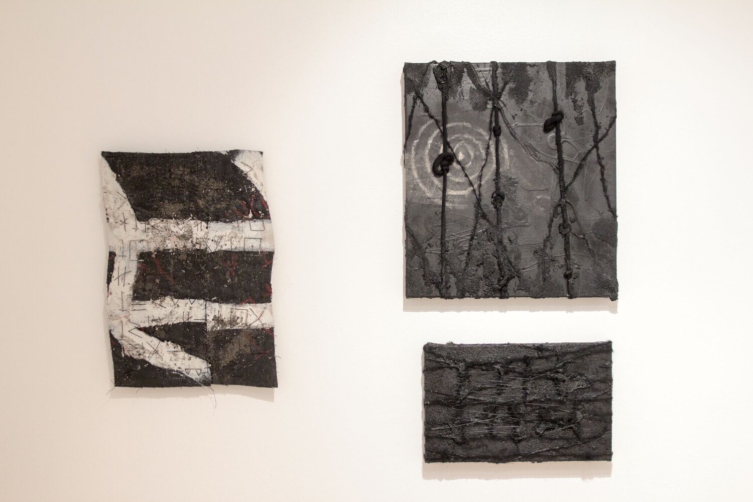 And yay! We are an LA Weekly Art Pick! I love Falling James’ descriptions of my “evocative and haunting collision of black and white paint burying hints of letters, words and other vestiges of communication under a seemingly random splatter of entropic plaster” and Samuelle’s “rough-hewn cloth sculptures of disembodied heads and squawking birds spliced up with scar-like stitches.”