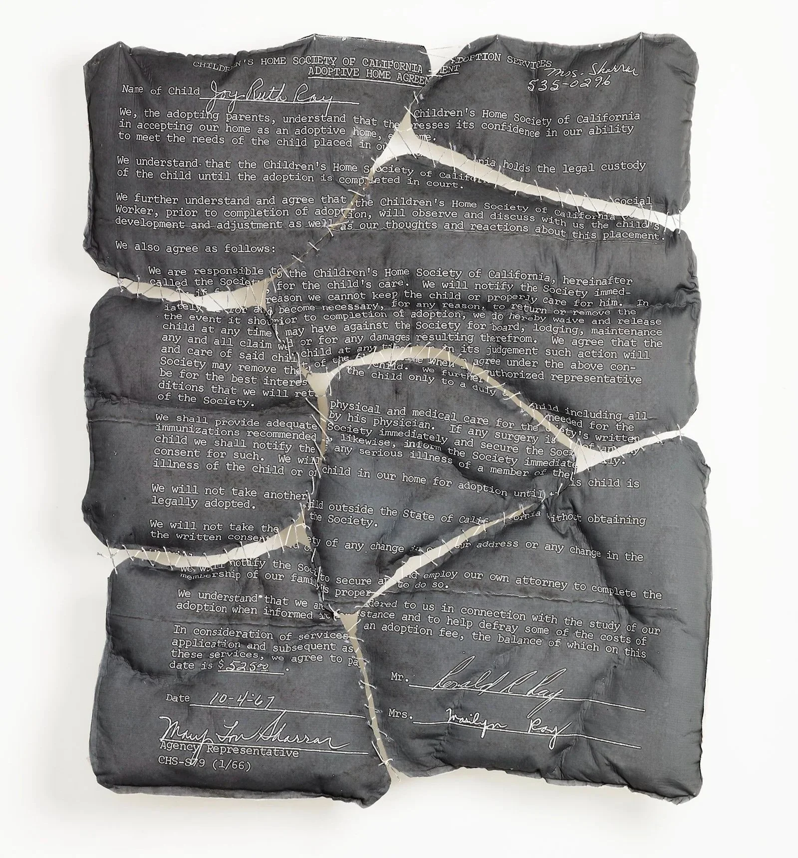 Joy Rayinvoice2023Fabric, twine, stuffing, paint.Text from “Adoptive Home Agreement” by the Children’s Home Society of California.48 x 44 x 6 in.